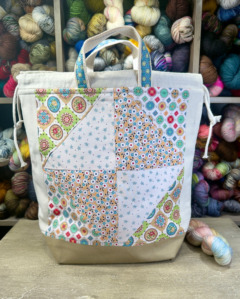 Each bag features a different Quilt (Patchwork) Square. Each is one of a kind. I wanted to explore doing bags in different, much loved or new block patterns in a variety of prints, much like the other bags I make, but in unexpected patterns and prints. I love the simplicity of traditional quilt block patterns and have had fun exploring new. As a child, I started sewing with doing quilt blocks and I am finding myself drawn back to quilting and wanted to extend this into my project bags for others to enjoy.